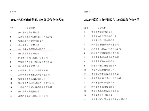 日前,由黃山市工商聯、市經信局、市監管局及市商務局聯合發布2022年度黃山市民營企業納稅及營銷收入百強名單公布,黃山建工集團連續多年再次實力入圍,獲此殊榮!