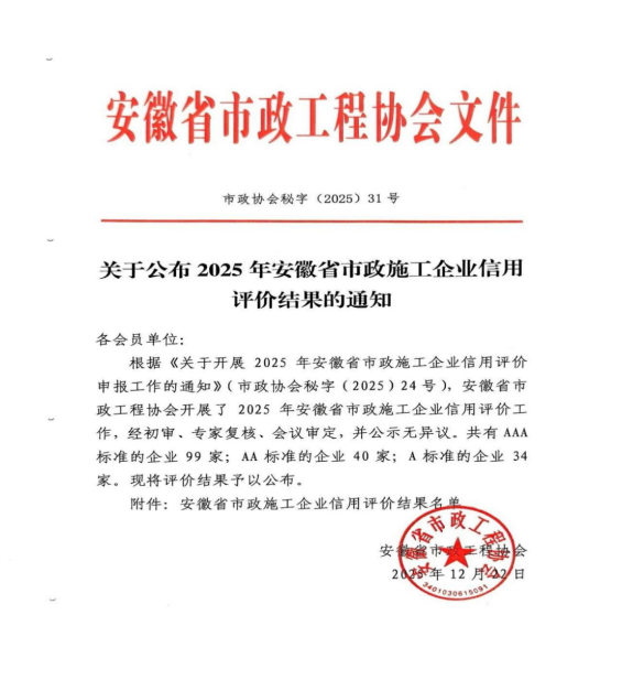 近日,安徽省市政工程協(xié)會正式發(fā)布《關(guān)于公布2025年安徽省市政施工企業(yè)信用評價結(jié)果的通知》。黃山市建工集團憑借卓越的綜合實力、規(guī)范的市場行為、優(yōu)良的工程品質(zhì)及堅實的信用體系建設(shè),成功獲評最高信用等級——AAA級。標志著集團在誠信經(jīng)營、履約能力與社會責任履行方面獲得了行業(yè)主管部門與協(xié)會的高度認可,是企業(yè)信用建設(shè)領(lǐng)域的又一重要里程碑。