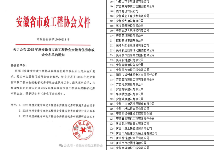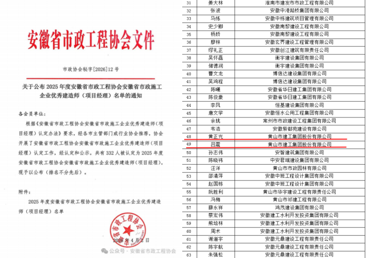 近日,安徽省市政工程協(xié)會(huì)發(fā)布了《關(guān)于公布2025年度安徽省市政工程協(xié)會(huì)安徽省優(yōu)秀市政施工企業(yè)名單的通知》及《關(guān)于公布2025年度安徽省市政工程協(xié)會(huì)安徽省市政施工企業(yè)優(yōu)秀建造師(項(xiàng)目經(jīng)理)名單的通知》。黃山市建工集團(tuán)股份有限公司憑借卓越的綜合實(shí)力與優(yōu)質(zhì)的工程業(yè)績(jī),連續(xù)多年榮登“2025年度安徽省優(yōu)秀市政施工企業(yè)”榜單。這也是繼集團(tuán)獲“2024年度安徽省優(yōu)秀建筑業(yè)企業(yè)”后,在工程建設(shè)領(lǐng)域收獲的又一重量級(jí)榮譽(yù)。 同時(shí),黃正光、呂震兩位同志憑借扎實(shí)的專業(yè)素養(yǎng)和出色的項(xiàng)目管理能力,雙雙榮獲“安徽省市政施工企業(yè)優(yōu)秀項(xiàng)目經(jīng)理”稱號(hào)。